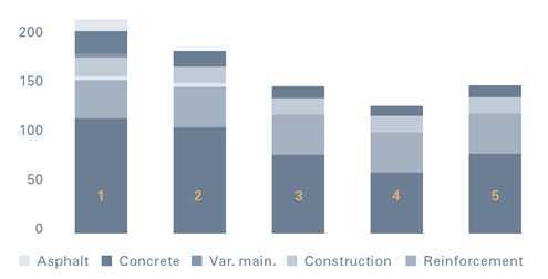 | The overall CO2-emissions for bridges built using different types of green concrete (tonnes CO2): 1 Traditional solution with black reinforcement and asphalt. 2 Stainless steel reinforcement. No asphalt on the bridge deck. 3 Stainless steel reinforcement. Green concrete with environmentally friendly cement. 4 Stainless steel reinforcement and green concrete with a high fly ash content. 5 Stainless steel reinforcement and green concrete with sewage sludge ash. |